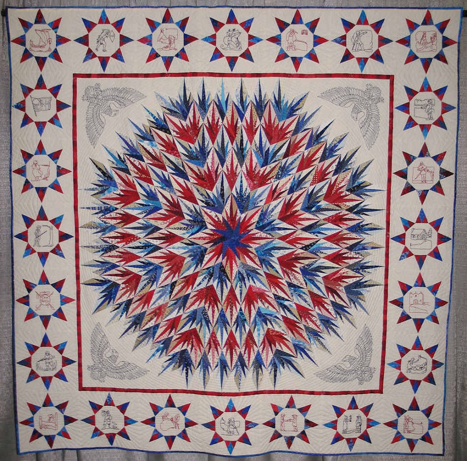This is the third and final in a series of Karen Stone patterns I've adapted to my own liking. The redwork and bluework embroidery patterns, I found on the Internet from a contest challenge. After having the quilt appraised, I learned the embroidery patterns are from Ruby Short McKim's series from about 1926 or 1930. The label is a Quilting Bee Design wall quilt that was big enough to fit all the information on it. I made three quilts into one!