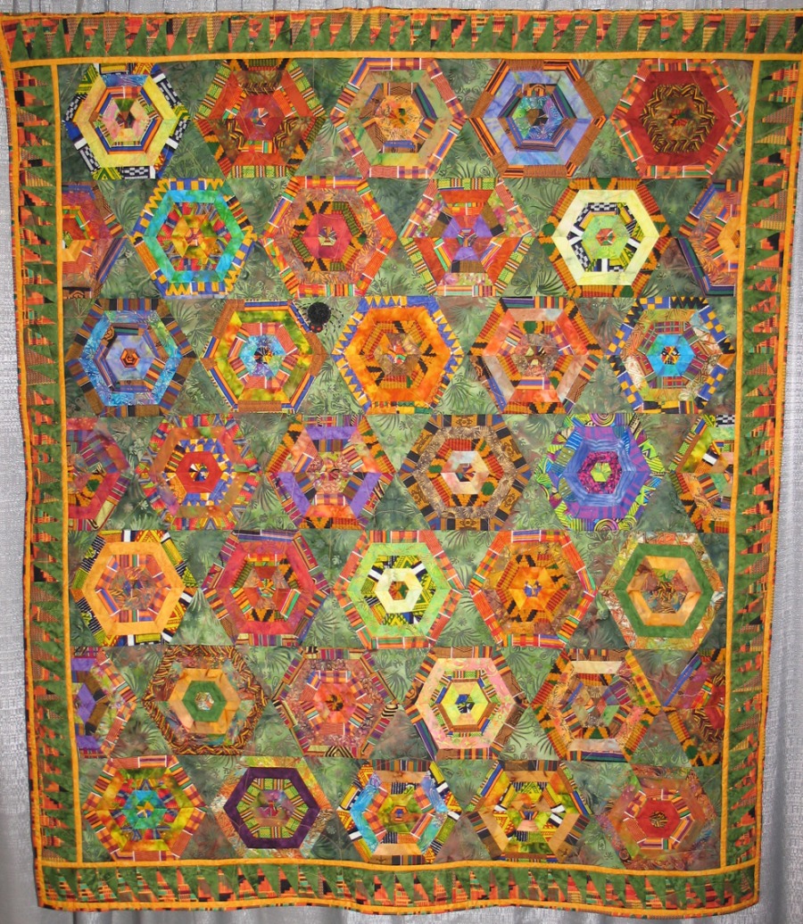 I made this quilt after reading an African folk tale about the origin of Kente cloth. Supposedly two weavers watched a spider spin her web and invented Kente cloth by copying the spider's movements while weaving cloth. I used several types of the American printed version of Kente cloth mixed with lots of batiks to create this quilt.