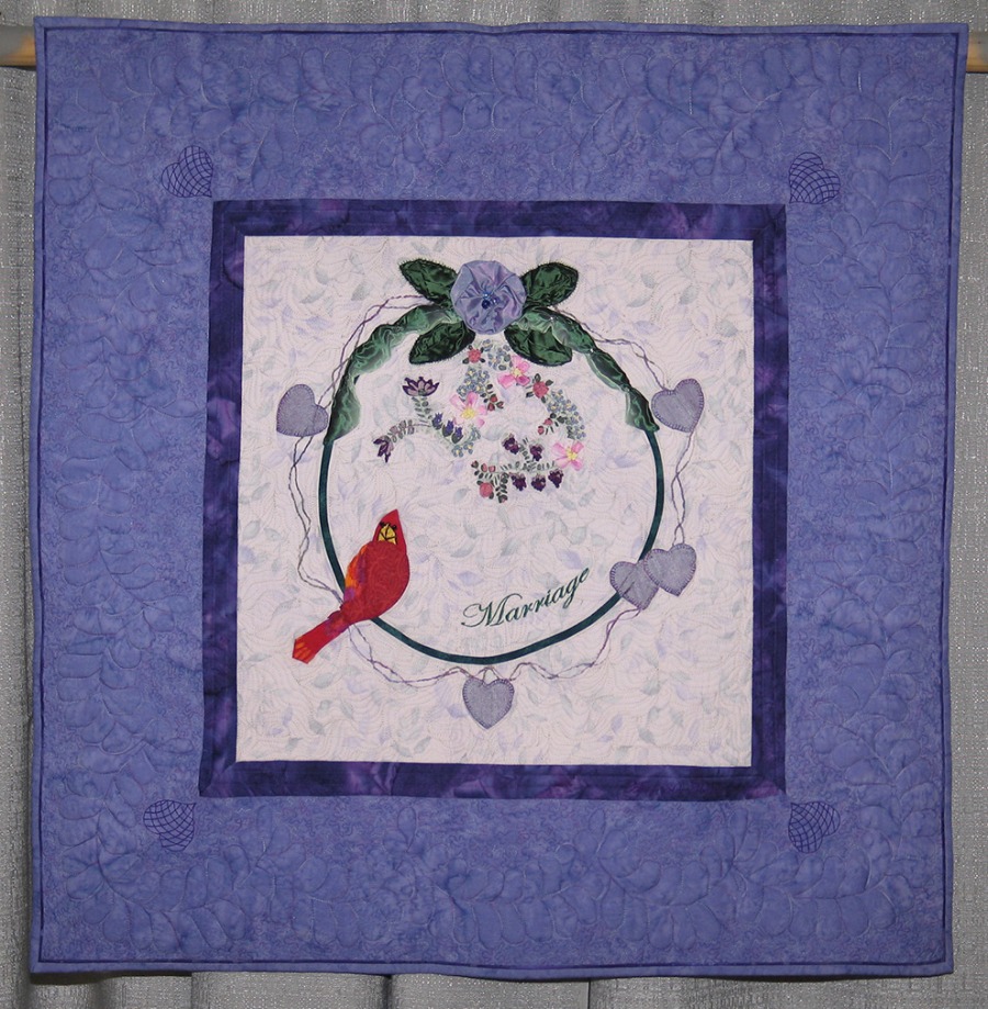 Julie and James were married on April 30, 2005. Julie loves purple, so the entire wedding was planned around a purple theme, except for the groom’s cake. James is from St. Louis and had to have a cardinal cake on behalf of his favorite baseball team. Months before the wedding, as I nursed a broken leg that kept me housebound, we beaded her wedding dress with over 7,000 glass beads. You can see a few of these beads on the green ribbon. This quilt celebrates their marriage and the beautiful wedding that united them.