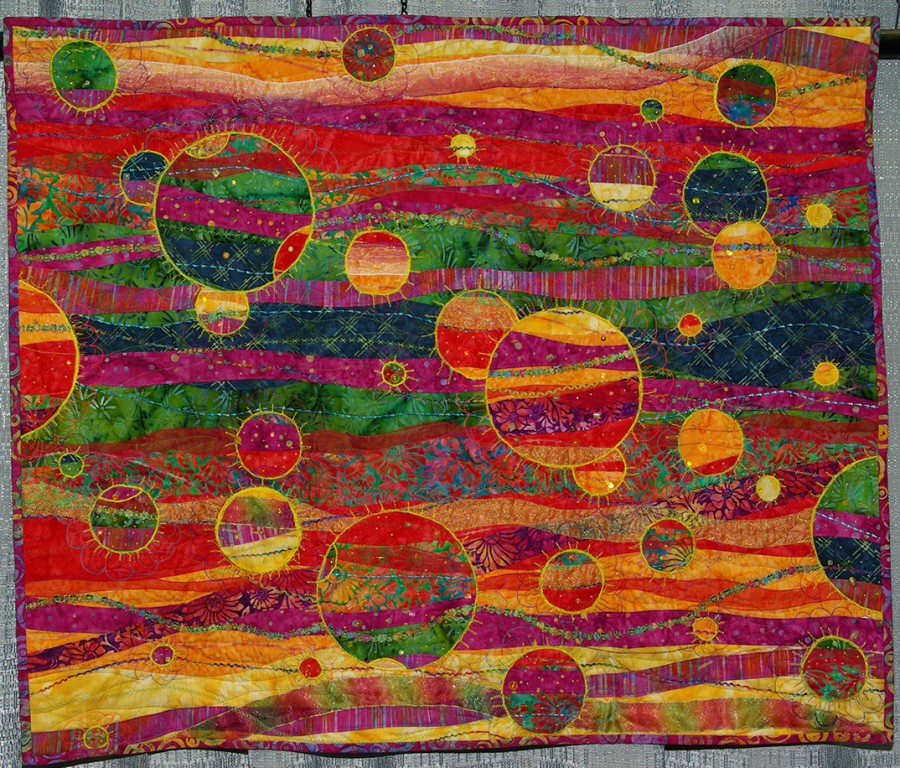My "Bubble Garden" quilt was created after taking an online course with Dena Crain. I loved her technique of borrowed shapes sewn back into the main quilt body with no seam allowance. Through my stitching, I kept getting the feeling of a happy garden with lots of bright colors. When I got to the finishing stages, I chose to stitch flowers around each bubble to enhance the feeling of a cheerful spring day. Though I had originally begun this design as a practice piece, it "blossomed" into a piece I really love!