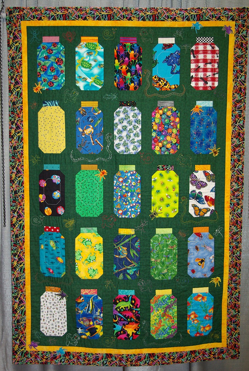 I am encouraging my grandchildren to quilt or at least get a sense of how much is involved in a quilt's creation. My grandson was 6 at the time we started the quilt. I let him select the background color. He sat on my lap and pushed the footpedal of the machine - FAST of course. He found out that it takes " A lot of time" to sew the blocks and he would tire quickly. It was so much fun adding the bugs, snakes, snails, etc. in the sashing. The spiders came aboard later and I am happy with the way they are exploring the jars and the label. I used glow-in-the-dark thread to write a special message to my grandson and to have some of the creatures and the labels keep him company at night. My message "I love Thomas" can be found in the right-hand border.