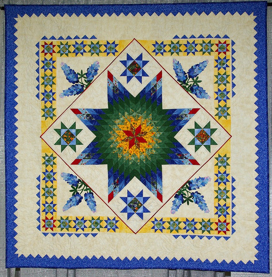 When Melissa Sullivan, past co-chair of the AAQG show, died over two years ago, she left the center Lone Star of this quilt on her design wall. As a tribute to our friend, Melissa, we've completed her "UFO" to celebrate her love of bluebonnets, and her love of quilting and being part of this AAQG quilt show.