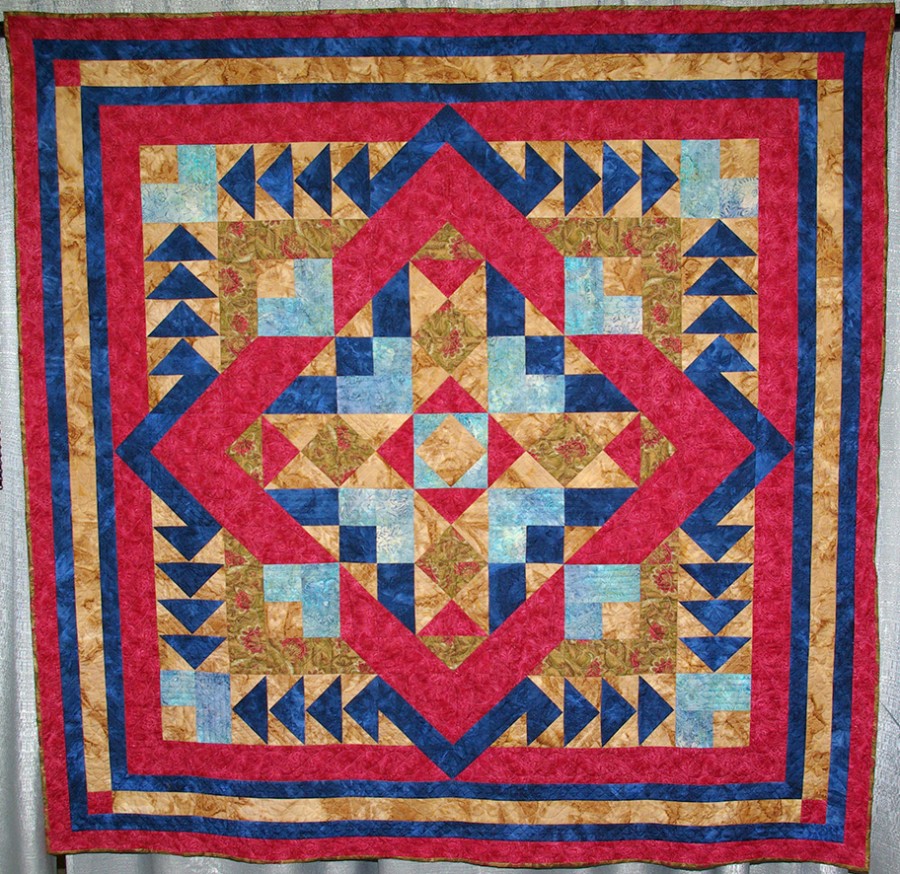 The pattern is from an online mystery project. It reminds me of a town center plaza and sidewalks, with geese circling overhead.