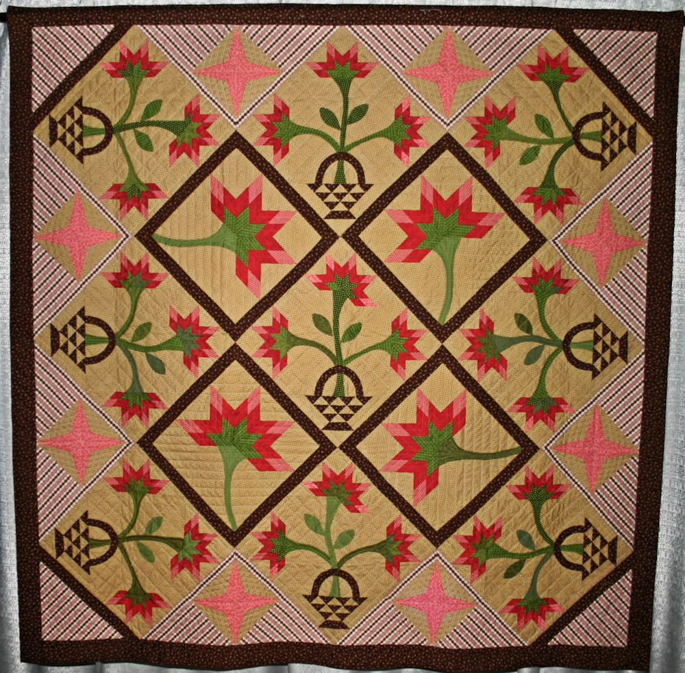A friend allowed me to use her c.1885 quilt to reproduce using current fabrics. The original maker used such a playful arrangement of the lilies, turning stems and leaves various ways. Not only that, she lay some on their sides, while others are sitting straight. To fill the edge with a striped fabric that did not coordinate with anything tells me she must have been a free spirit. Had the owner not allowed me to have the quilt in my possession, I would never have figured out the setting and stem arrangements of the blocks.