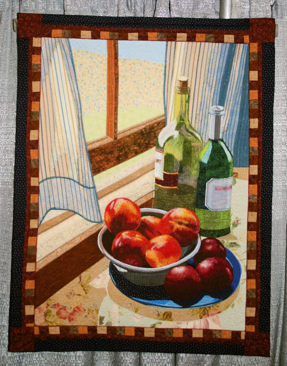 This quilt pictures my favorite place to vacation and relax. It is based on a photograph I took of the kitchen window in a centuries-old house overlooking Cape Cod Bay, where we have often stayed. It brings back memories of the tastes and wonderful clear light. The pieced border and the shadowed vintage print on the table pay homage to visitors who must have stayed there in years gone by. I long to, once again, stand in that spot, hearing the fog horns in the distance.
