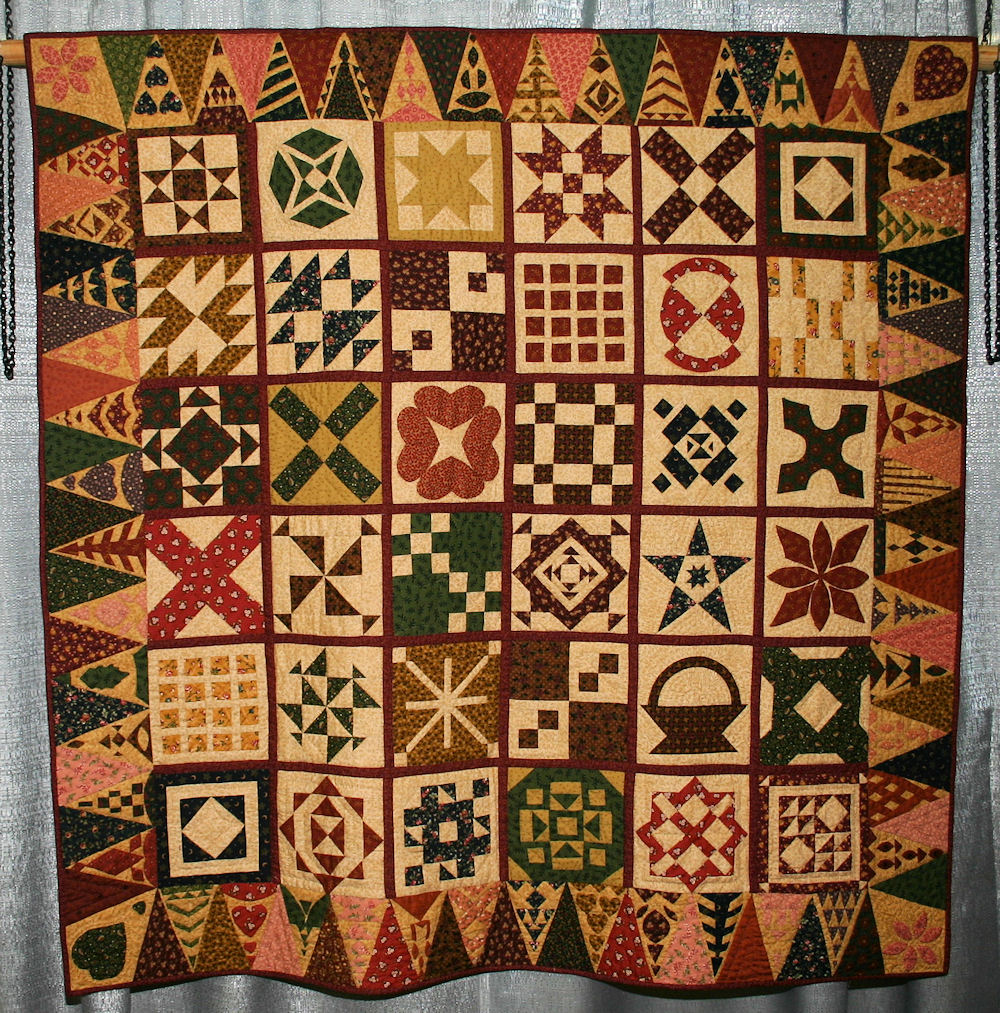 The blocks in this quilt were created by the members of Match-a-Patch Bee as a gift to me after serving as bee coordinator in 2006 and 2007. After receiving such a beautiful set of blocks, I thought "Oh dear, How can I properly display each person's work?" I decided to showcase the blocks with an elaborate border in the "Dear Jane" tradition and quilt by hand.