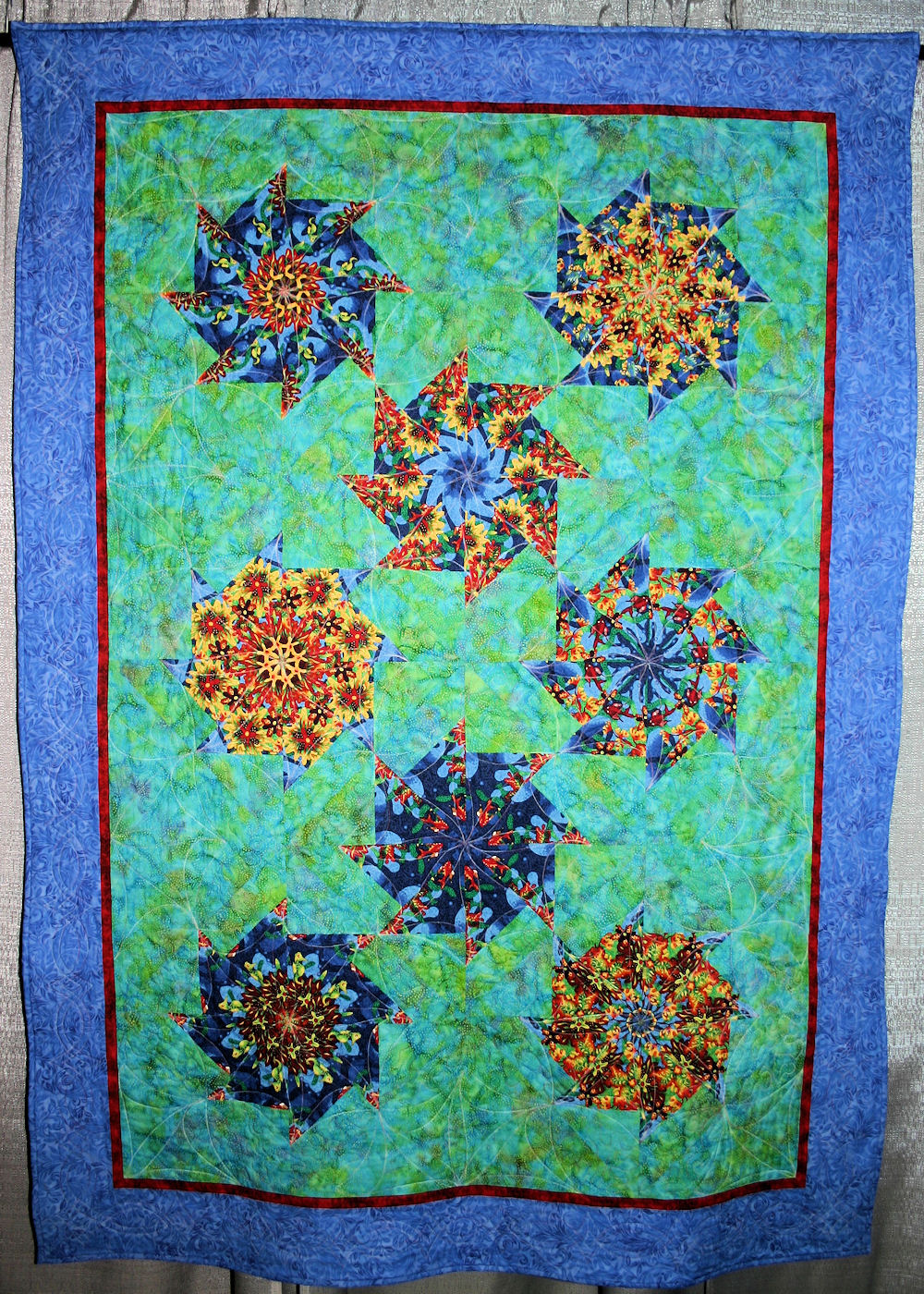 The kaleidoscope look of a stack-n-whack quilt appealed to me so I gave it a try. It seems that there is no way to really know how the final product will appear so it is a fun surprise to see the pinwheels develop. I like to spray baste the quilt sandwich but setting up a large enough horizontal area outside for this one was a problem. I now have a wall set up in my house for spray basting vertically. It worked well for this quilt.