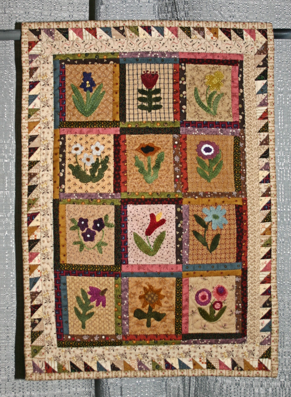 I enjoyed doing my first miniature quilt. The flowers are hand appliqued from felted wool.