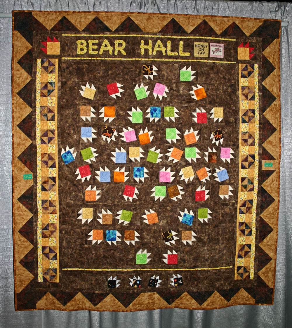 I love the bear paw pattern, but wanted to do something very different with this quilt. I made the bears dance! The musicians are on the bottom and the rest rooms are out back. There're even signs to direct any wondering bear through the mountain passes. It's a silly quilt, but would look great in a country cabin.