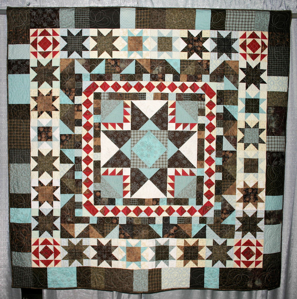 I have always liked quilts with stars. When I saw this pattern sample, it was made using fabrics that blended together. I made mine using fabrics that contrast and I am pleased with how it turned out. This quilt was made for a sample for kits offered thru Fat Quarter Creations.