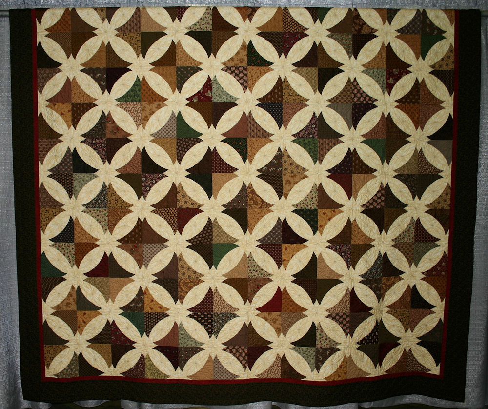 One of my earliest memories is seeing both my mother and grandmother piecing quilts on their old Singer treadle sewing machines and then hand quilting them. Many of the fabrics used in their quilts came from the scraps left after making clothes for themselves, my brother, and me. I still have some of these early quilts and can point out fabrics used in some of these clothes! Mom tried desperately to teach me various types of needlework and quilting when I was young, but that was too "girly" for me at the time. Finally in 2002 (at the age of 53!), I took my first quilting class and discovered I loved it! My mother and I began sewing together each Friday in 2009 and completed this quilt together. As a tribute to her for all the times she tried to teach me about the joys of needlework and quilting, and for her dedicated help on this quilt, I have named it "A Bouquet for Mom." Thanks, Mom!