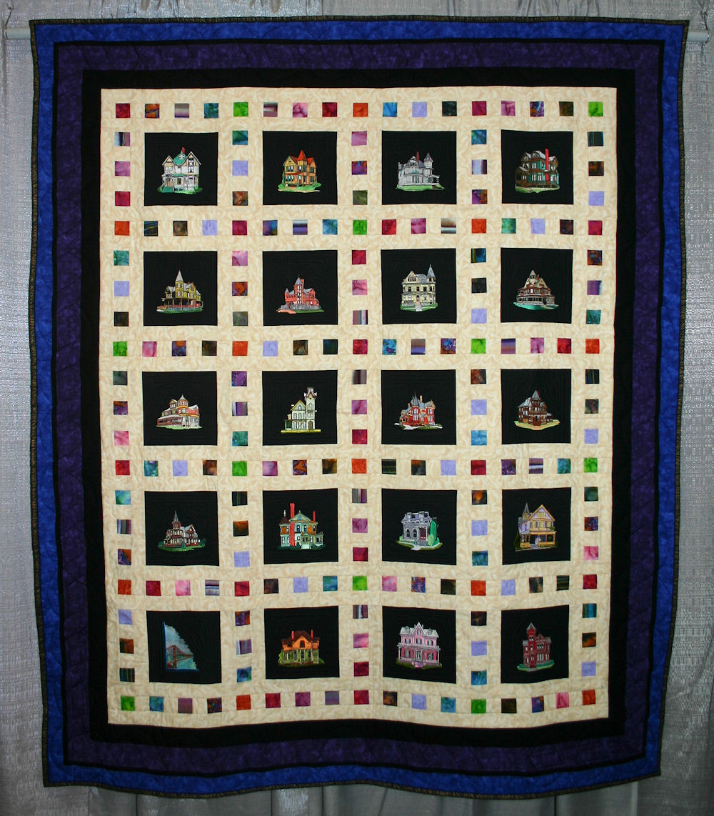 Homage to Kodachrome, which Kodak no longer makes, and to the wonderful "Painted Ladies" of San Francisco. Embroidered designs are from Victorian Houses collection #515 from OESD (Oklahoma Embroidery Supply & Design). Golden Gate Bridge design is from OESD Enchanted Innovation Collection. Piping technique was taught by Ricky Tims. The backing fabric includes some of my favorite designs by Alexander Henry for another image of San Francisco and associated memories.