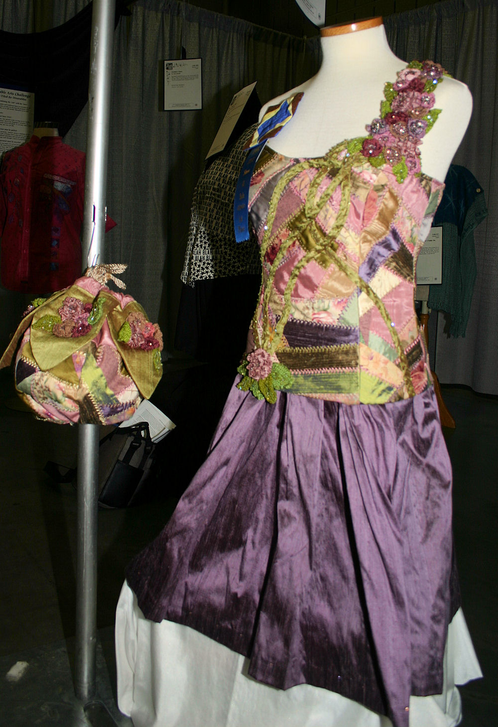 This head turning garment was inspired by some old rayon ribbon that I inherited. It was knitted in a very ugly skirt. I loved the color so I took it apart and ironed it out, then ran it through my ruffler attachment to create flowers. The bodice of the dress was crazy quilted using various fabrics. All the seams were done with bobbin work using decorative threads. I made bear tubes from silk and applied them to front and back. The asymmetrical bodice was achieved by applying handmade crochet flowers and leaves with beads over one shoulder. The skirt is 100% silk. There is a matching crazy quilted purse to complete the outfit.