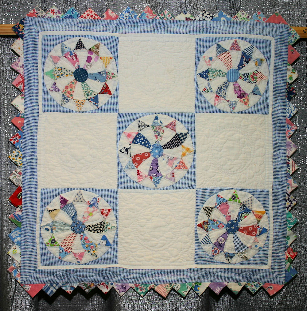 I love to collect scraps of vintage fabric and since they are usually small pieces, I reduced this traditional pattern to 6-inch so I could use them. It has been waiting to be quilted for about 10 years. I used the quilt show as my incentive to finally complete this. It is amazing how the small quilts seem to take the longest to complete.