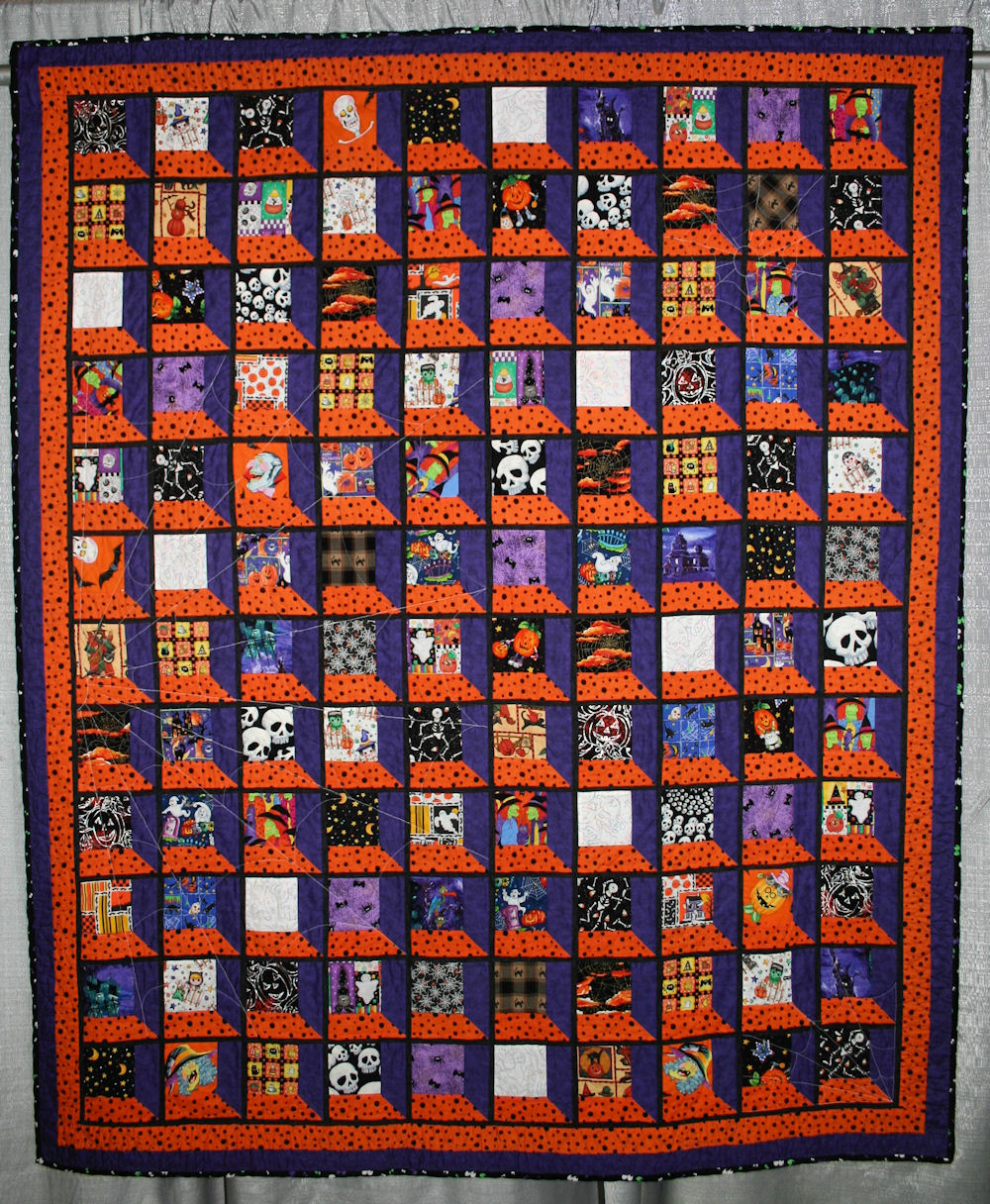 One of my favorite occasions to decorate for is Halloween. So a "get in the spooky mood" quilt seemed in order. The attic windows make me think of an old decrepit mansion with cobwebs everywhere and bats flying all about. I can even imagine hearing the church or township bells slowly tolling the midnight hour in the background, while mysterious creatures cackle, giggle, and scream into the night.