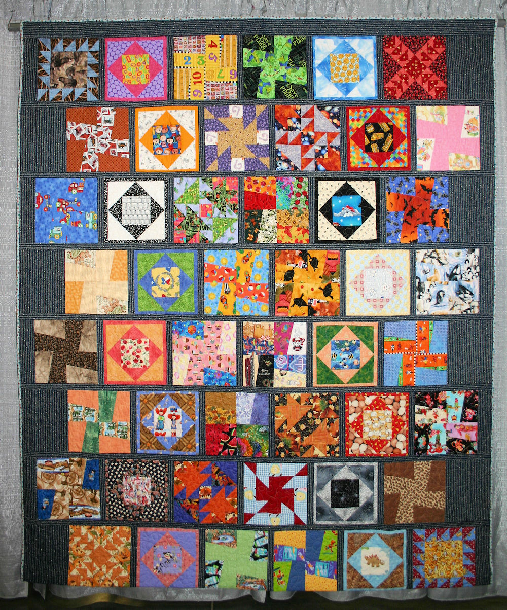 I made this quilt to express my great appreciation for my daughter’s Kindergarten teacher, Mrs. "D." Each of the 48 blocks represents a subject(s) the class learned. I traced each child's hands and made a copy of their signature. Mrs. "D" called her class the Shining Stars and it is written in Sign Language; another gift she taught the children. This was my first try at long-arm quilting. Block map enclosed.