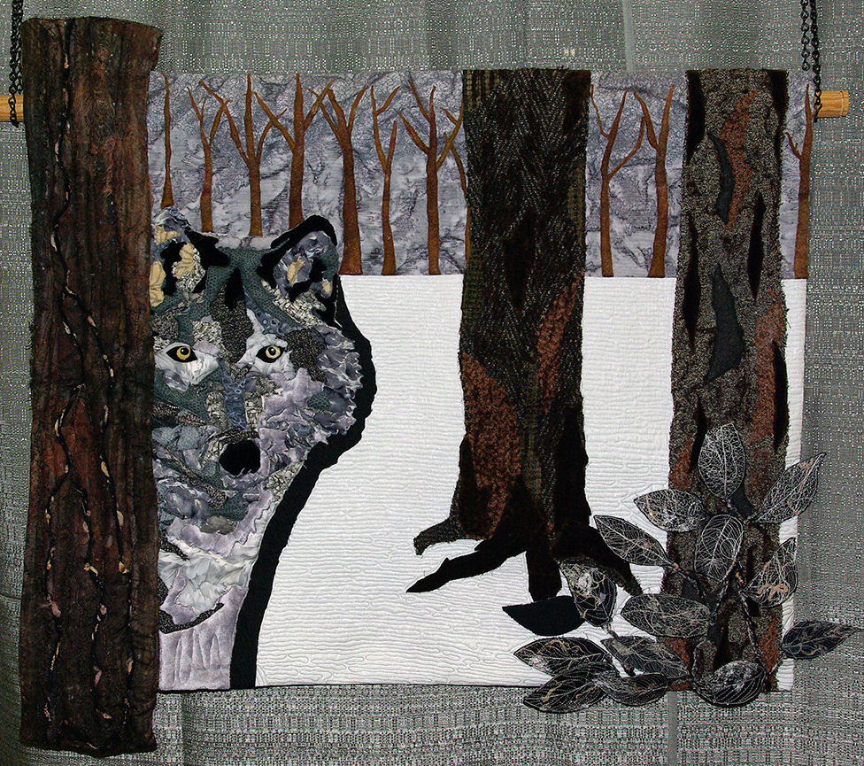 Shadow Dancer is Part IV of Naturescape Gray Scale Series and was created in larger format, increasing scale, delving into texture, and creating a more 3 -dimensional effect. I construct a lot of my own surfaces by building layer upon layer of fibers. The trees in the background are made from dyed batting and are machine appliqued. Their canopies are thread painted. The larger two trees in the foreground are composed of upholstery fabrics and have been machine needle-felted with bits of wool roving to add texture. The tree to the left in the foreground is created by adding layers of dyed fabrics and fibers including cotton and cheesecloth to assemble a new cloth reminiscent of tree bark. It is also built up with several layers of batting to provide dimension. Machine wrapped cording was used to represent ridges in the tree bark. The wolf is composed of several layers of various fibers including cotton, velvet, silk and upholstery fibers. His eyes are painted with shiny 3-dimensional acrylic paint. The bush on the right was created in black and white with machine wrapped cording as stems and the leaves were tacked down in a 3D manner.