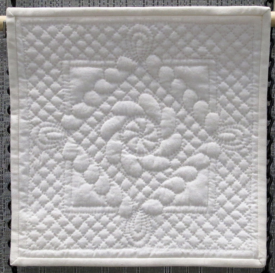 I made this little quilt because I loved whole cloth quilts but was afraid to tackle a bed sized one. I also loved making miniature quilts and had a collection of almost every issue of Miniature Quilts Magazine. This pattern was in one of the issues. It was also one of my early hand quilted projects.