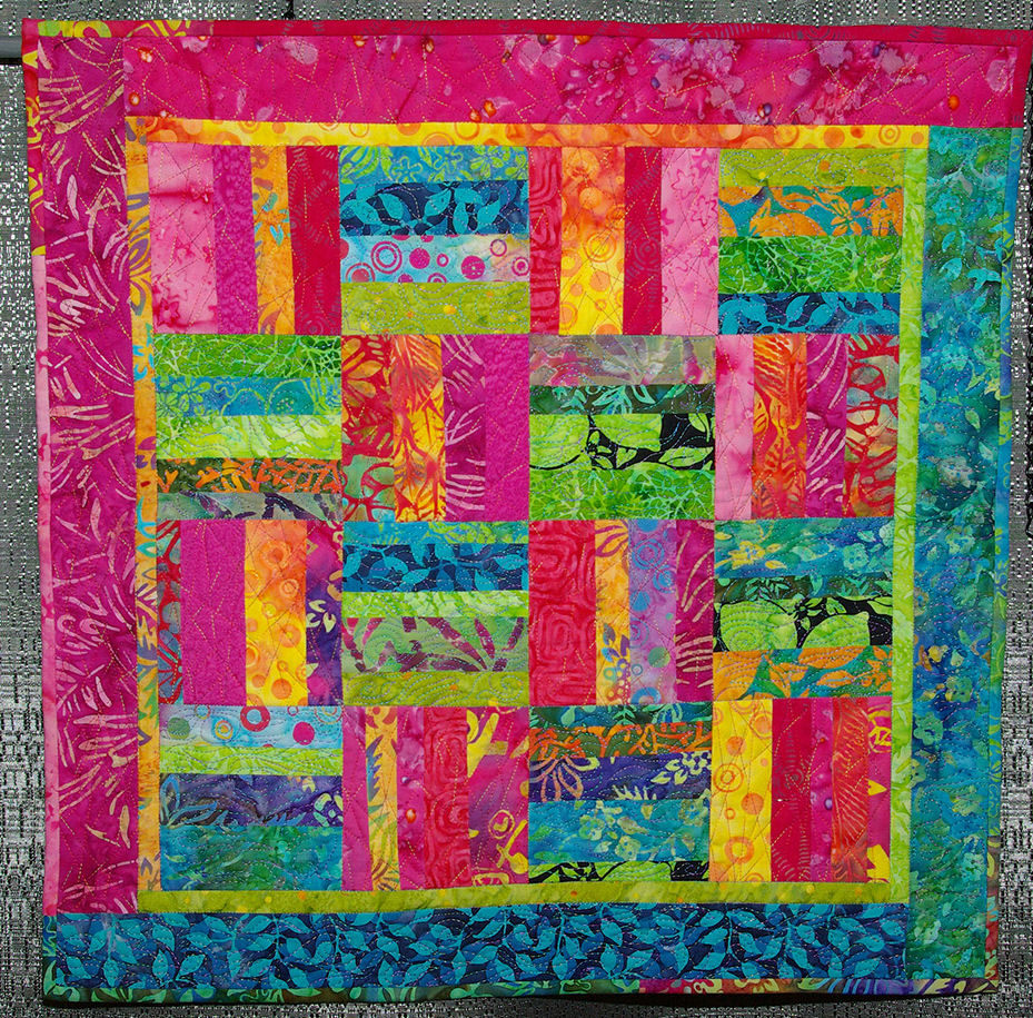 I once joined a batik charm square exchange. I had fun cutting out my batik squares, but then had a bunch of left-over scraps - a lot of them were 5 inch crooked strips from the ends of rows. My batiks looked great together, so I decided right then and there to make a quilt top out of all my scraps and only these scraps. I knew it wouldn't be big, but figured a doll quilt for my girls would be great. I've seen all these "improv" blocks and decided to just go with the crookedness of the scraps. And I love it! The only fabric added to my scraps to make this quilt was the backing. In fact, I love this quilt so much that instead of giving it to my girls as a doll quilt, it hangs next to my sewing machine where I can look at it every time I'm getting creative.