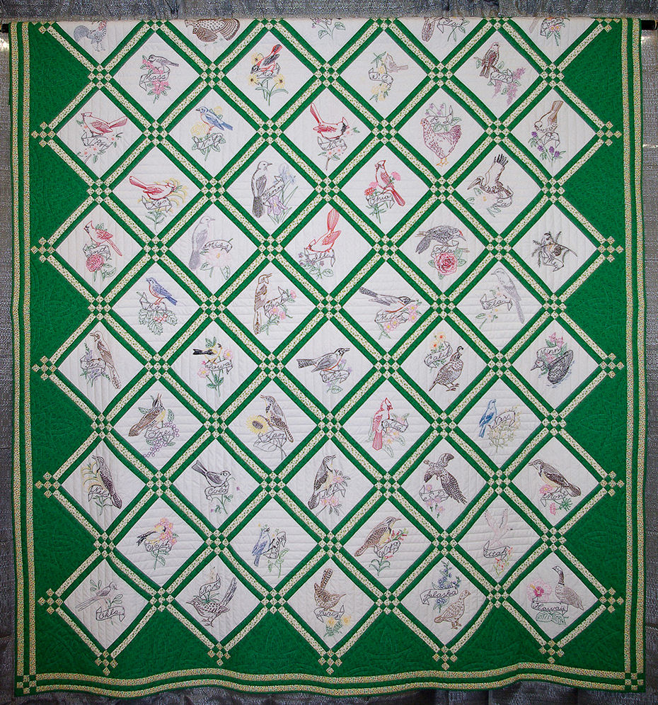 These 50 blocks were hand embroidered by my husband's niece, Janice Johnson Grady (1940-2012). Embroidered blocks that included birds and flowers of each state were popular from about 1930-1965. These block patterns are of the later period and include the last two states: Alaska and Hawaii. She embroidered many sets of these blocks about 1985. The embroidery on these blocks is exquisite. Kathleen chose to use triple sashing, nine-path intersections and hand quilting to finish the quilt.