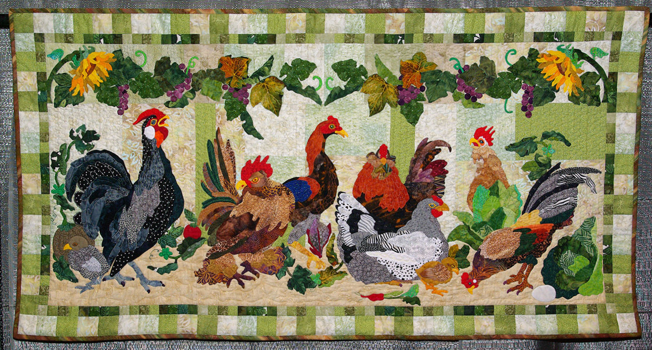 This wallhanging depicts a garden dinner party where Bantam hens and very colorful cocks are probably gossiping about another hen who could not attend! I have recently come to appreciate the beauty of fowls, especially noting their eyes and the many layers of smoothly moving feathers. When I retired, I began looking for a project that would help fill my hours --- and this one certainly did. I learned so much about needle turn applique as I completed a piece, only to redo it later, or found shortcuts, or experimented with a different technique. The machine quilting evolved as well!