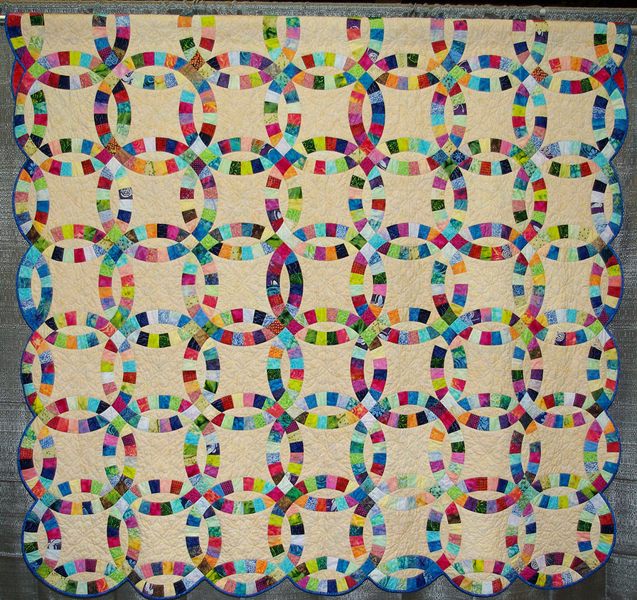 I wanted to make this quilt to celebrate our 50th wedding anniversary which will be August 27, 2016. Well, I am happy that I have completed this quilt early as my husband was diagnosed with small cell lung cancer about 1-1/2 years ago. I received this quilt kit from my dear sweet daughter-in-law, Annette, for my birthday in 2008. I did all the piecing and all the quilting. Some friends helped to pick the fabric and arrange the fabric for the melons as I got rather tired of doing that myself. And, that is why I ended up with some of them being all blue! Just to add a little interest, I added a few batik fabrics from my stash. There are 127 melon units with each unit containing 14 different fabrics. This is a precut Double Wedding Ring quilt purchased from John Flynn (http://flynnquilt.danemcoweb.com/). If you are ever going to buy a precut kit - this has got to be the one to buy! All those little pieces! And he notches the center 'square' so it is very easy to match up the curved pieces. This was fun and a challenge but I will never do another DWR quilt!!