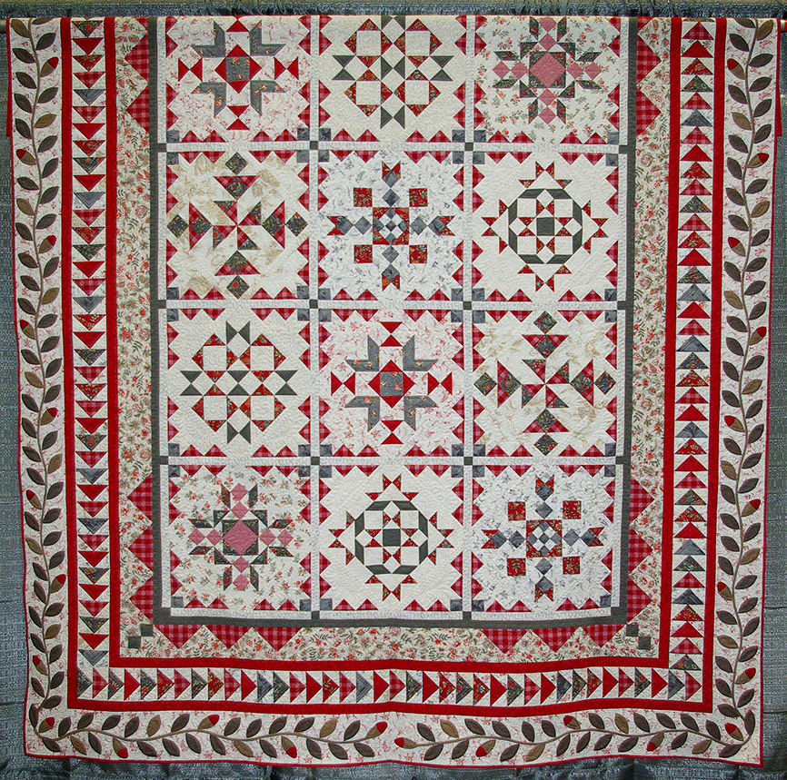 This is a Block of the Month called 'Love Letters' by Sherri Falls. I added the flying geese and leaf applique borders.