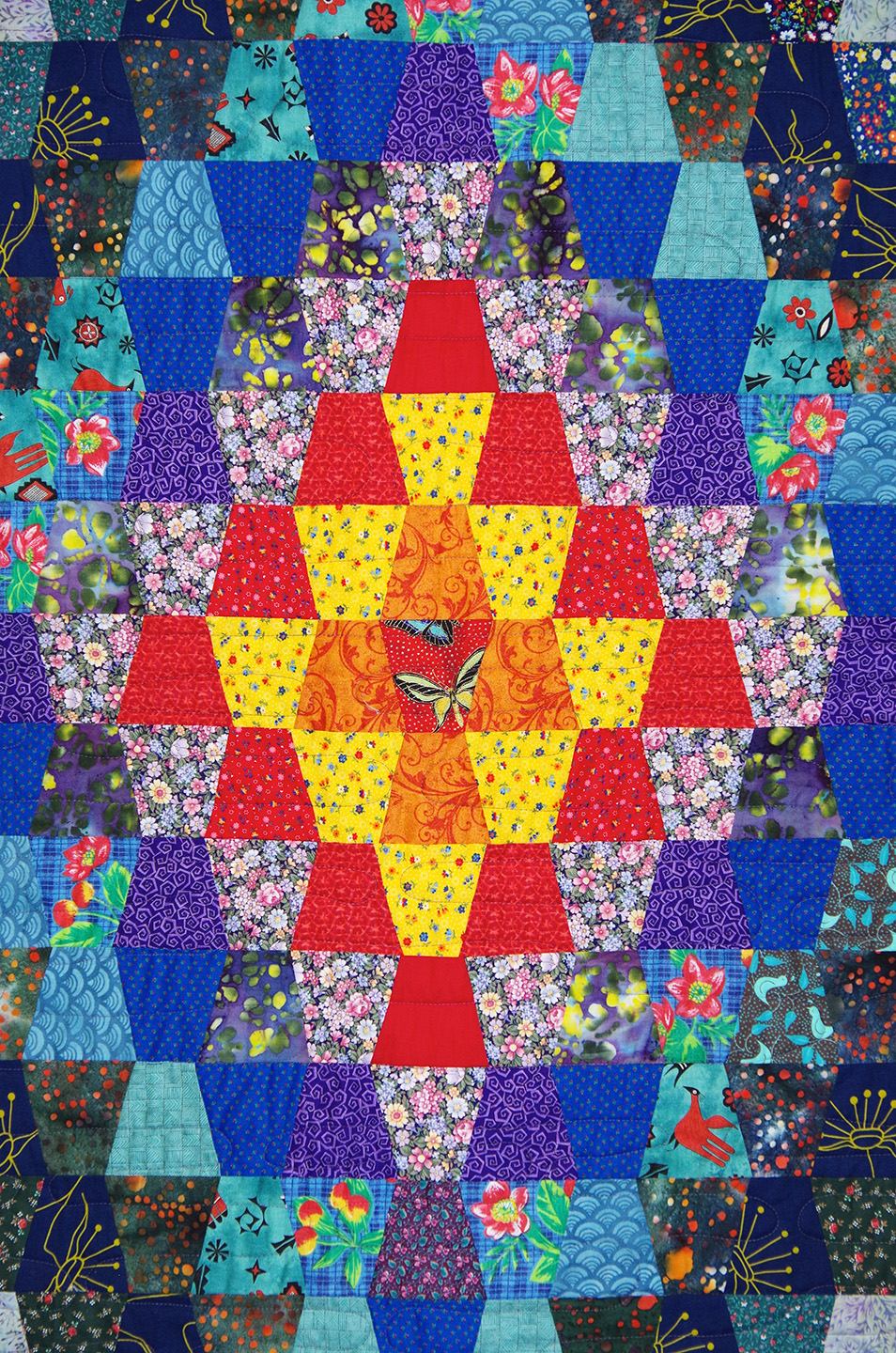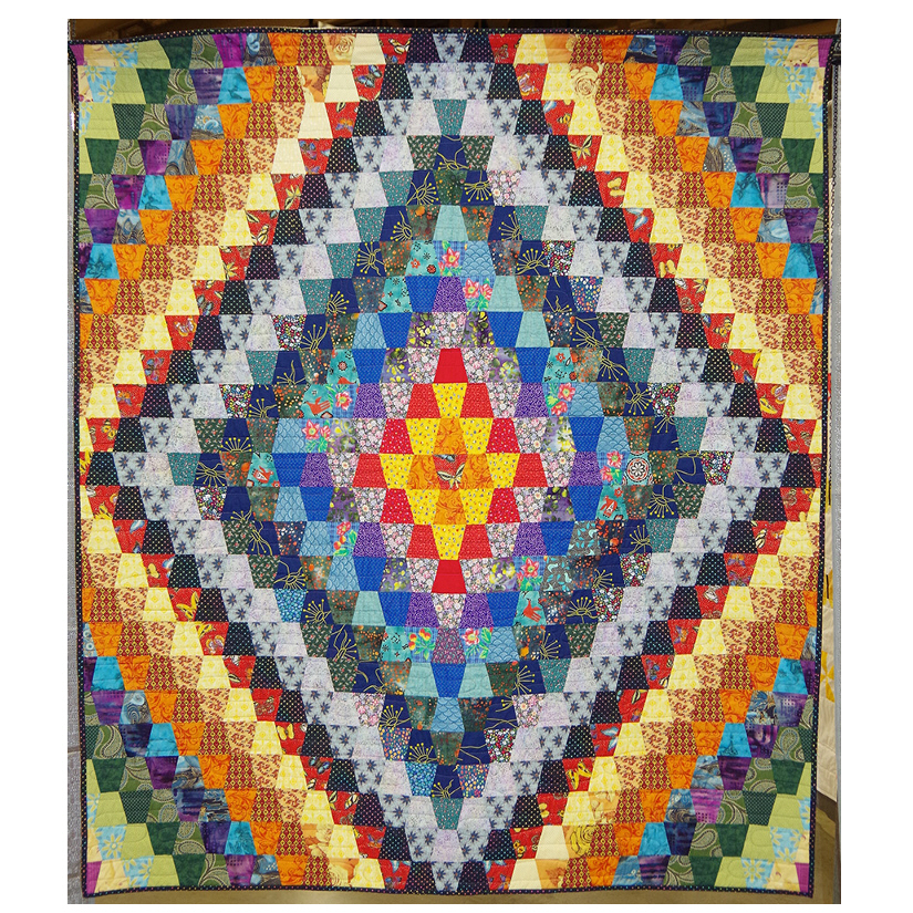 | Scrap Happy is just that - I was happy to use up a lot of scrappy pieces of material! The beginnings of this quilt came last winter when a fellow guild member put out the challenge to "use your stash" to create something new. I've used the tumbler pattern before and was pleased with the result so I had already started cutting up left overs with the thought of putting a scrappy quilt together one day. Mostly, I was surprised to find out how many bright colors I had in my stash. At first I thought it was too bright; but after it was finished, I loved it. The back was more of a challenge but I was lucky enough to have just the right amount of material for the pattern. Everything came from my sewing room - fabric, batting and thread. |