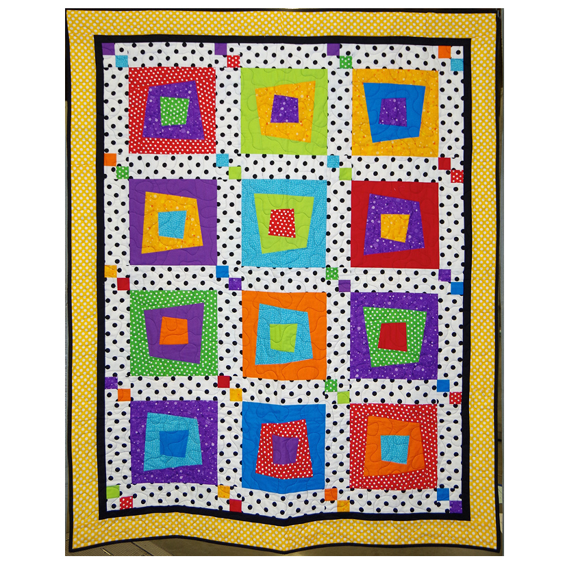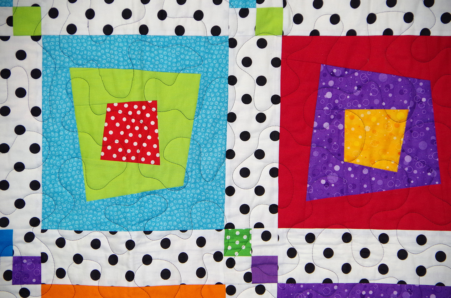 | I wanted to make a quilt using polka dots and this "Cracker Snackers" pattern by Quilt Soup Company was what I made. The 12 blocks are the front side. I use leftover scraps to make the back side. I was "Clowning Around" when I created the back. The polka dots and bright colors remind me of clowns and make me smile. So look at the back and smile! |