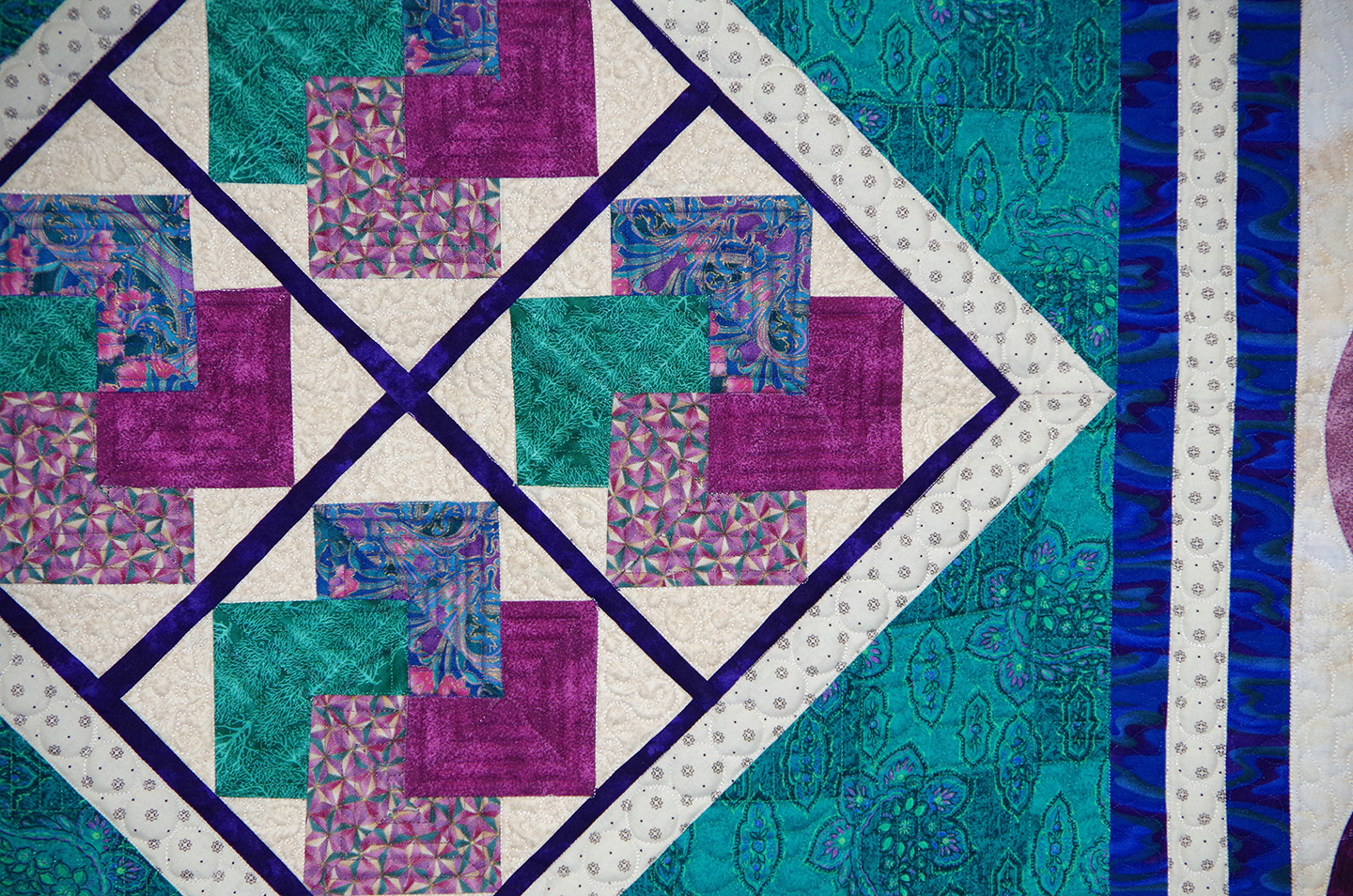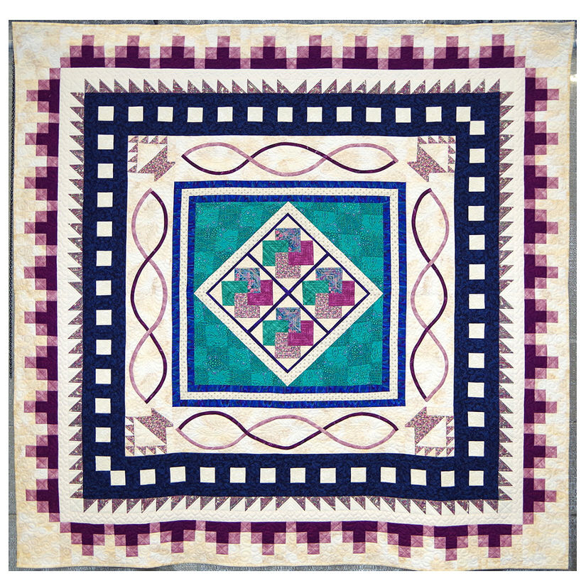 | My mom was the first to start teaching me to sew. My fourth grade teacher introduced me to quilting by helping some of us to hand-piece squares during recess. Then I took sewing classes as part of Home Economics classes in junior high and high school. Finally, while in college I saw Eleanor Burns on TV demonstrating strip piecing. I was definitely intrigued and made a small project on my own. About 1995, I found Gem Fabric, a quilt store that use to be located in what's now the Lakeline mall area. I finally took my first introductory quilting class there. Next, I nervously joined the Quilt Sitter's Circle where we made a round robin quilt. All of us in the group were probably nervous about sewing on each other's quilts, but it was fascinating to see all the different quilts take form. So I started this quilt by making the center card tricks block and first round of blue and beige borders. Then each member of the group sewed on a new border to create the quilt you now see. This was one of my most ambitious projects and created so early in my quilting days. Completed 2013. |