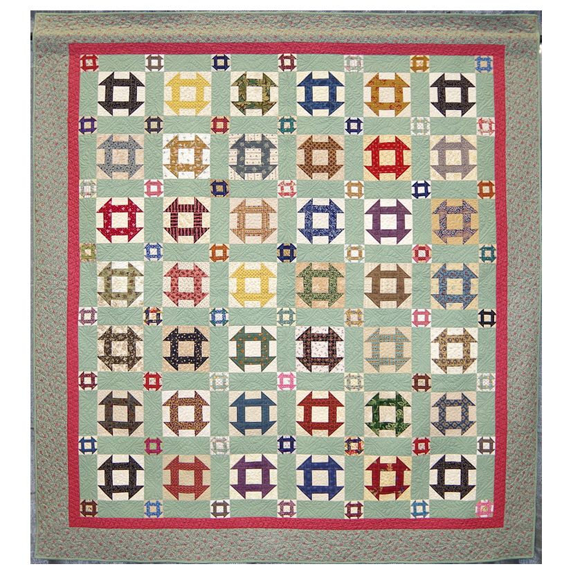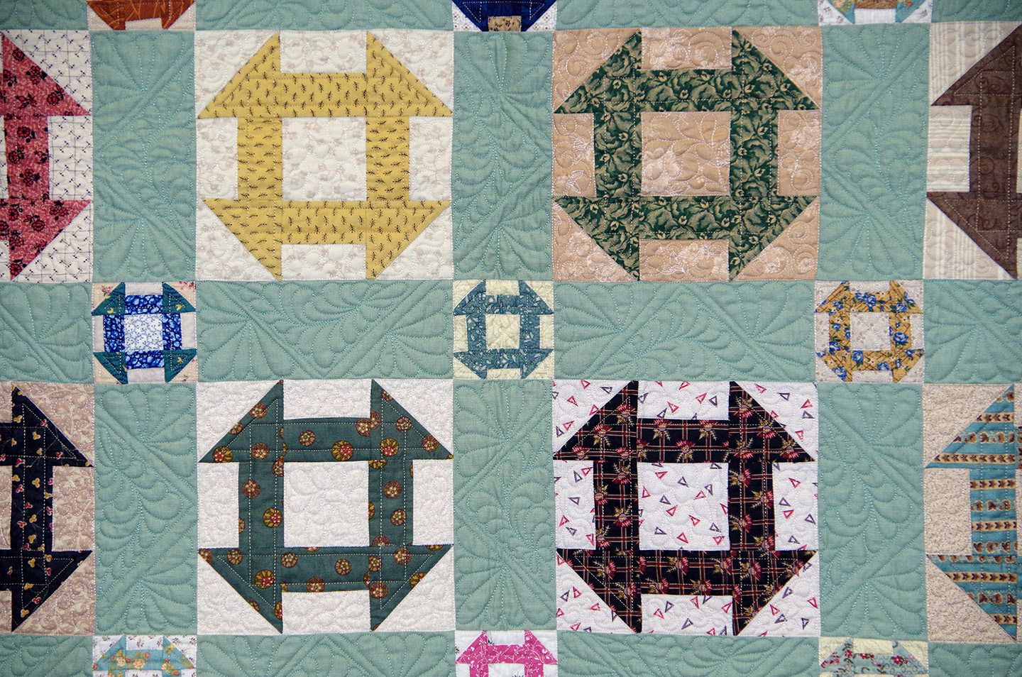 | My quilt is the result of a block exchange with 5 of my friends. We all try to meet in Houston and go to the Festival together. It was so much fun to see how each of us used our churn dash blocks. All of our quilts are beautiful and they are all very different. Cindy Megginson's quilt won a blue ribbon with her guild show in Cypress, Texas. |
